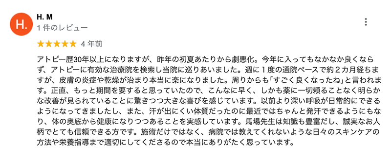 今年に入ってもなかなか良くならず、アトピーに有効な治療院を検索し当院に巡りあいました。