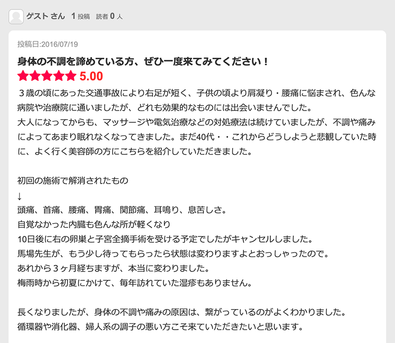 現在、私と同じ様な思いや経験をされている方は絶対に馬場先生の施術を受けて頂きたいです。