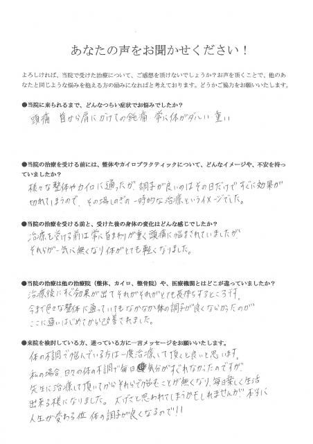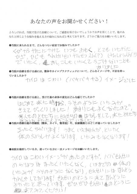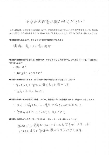 カイロはこわいイメージがあったのですが、馬場先生の治療はまったく痛くなく、今までの体の痛みがうそのようになくなり、先生には本当に感謝しております!