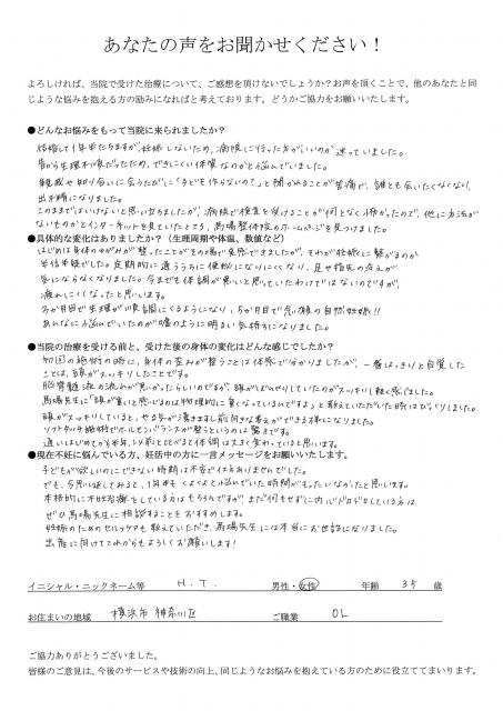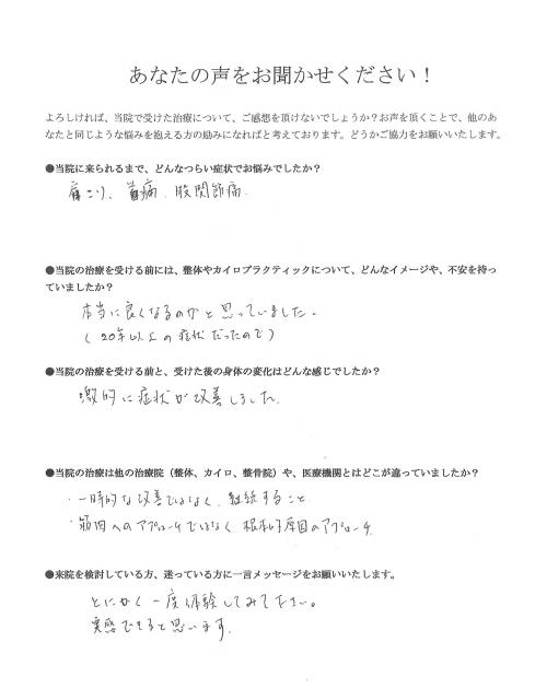 先生に診て頂くまで何度も「今度こそ良くなる!」と信じて通院してましたが、1度も良くならず、症状は悪化するばかりで精神的、肉体的にも辛かったですが、先生に診て頂き、いちるの望みが持て、痛みやハリ感はまだありますが、確実に症状は改善しています。