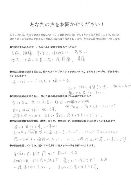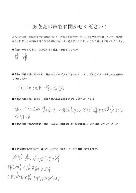 以前に通ったカイロプラクティックでは、状態が悪化したので治療に対して恐い、不安な気持ちでした。